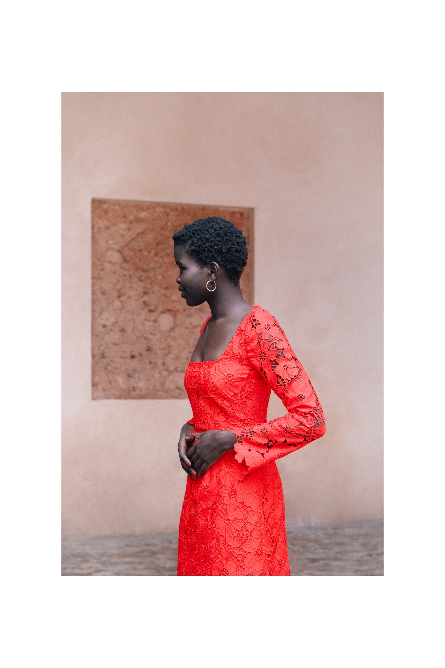VESTIDO MIDI CON CORTE EN CINTURA,FALDA EVASÉ, MANGA FRANCESA, ESCOTE CUADRADO Y CIERRE DE CREMALLERA EN LA ESPALDA