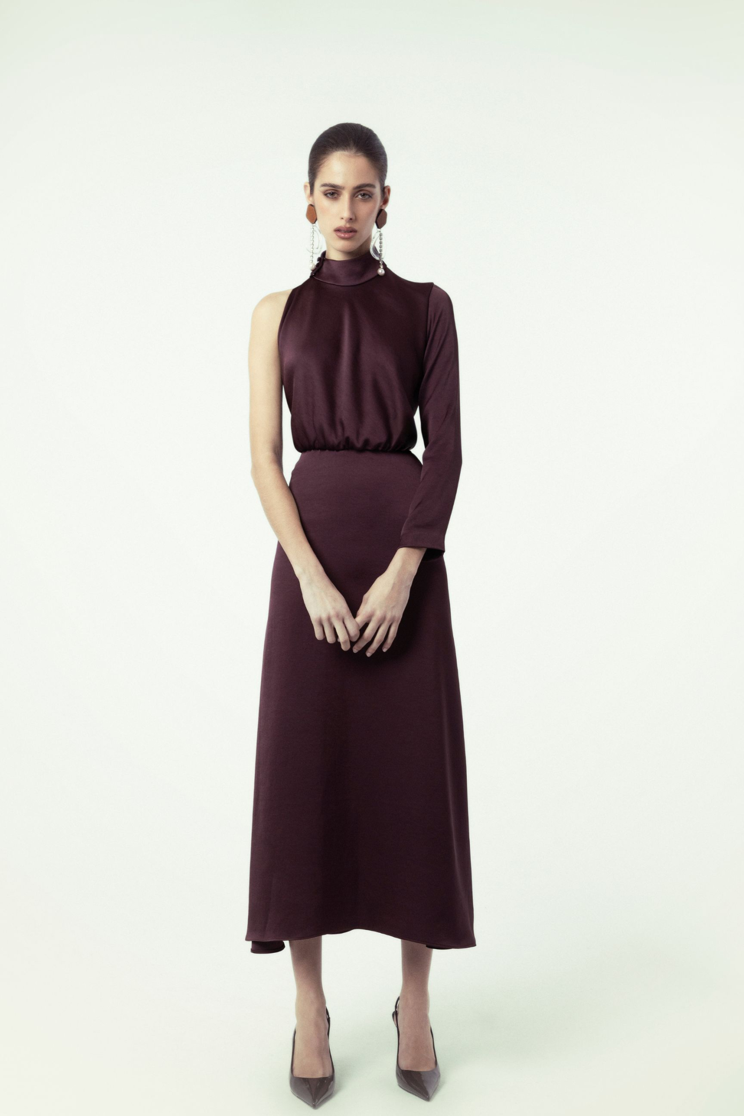 VESTIDO MIDI CON FALDA EVASÉ, ASIMÉTRICO CON UNA MANGA CAMPANA Y ABERTURA EN LA ESPALDA, CIERRE DE CREMALLERA EN LA ESPALDA